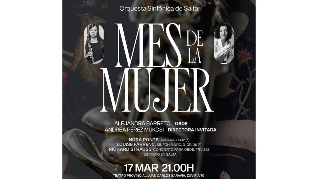 Salta, Argentina – Continuando con el ciclo dedicado al mes de la Mujer, la Orquesta Sinfónica de Salta brindará un concierto el jueves 17 a las 21 horas en el Teatro Provincial “Juan Carlos Saravia” (Zuviría 70). Bajo la dirección de la Maestra Andrea Perez Mukdsi, y la participación de Alejandra Barreto como solista en […]