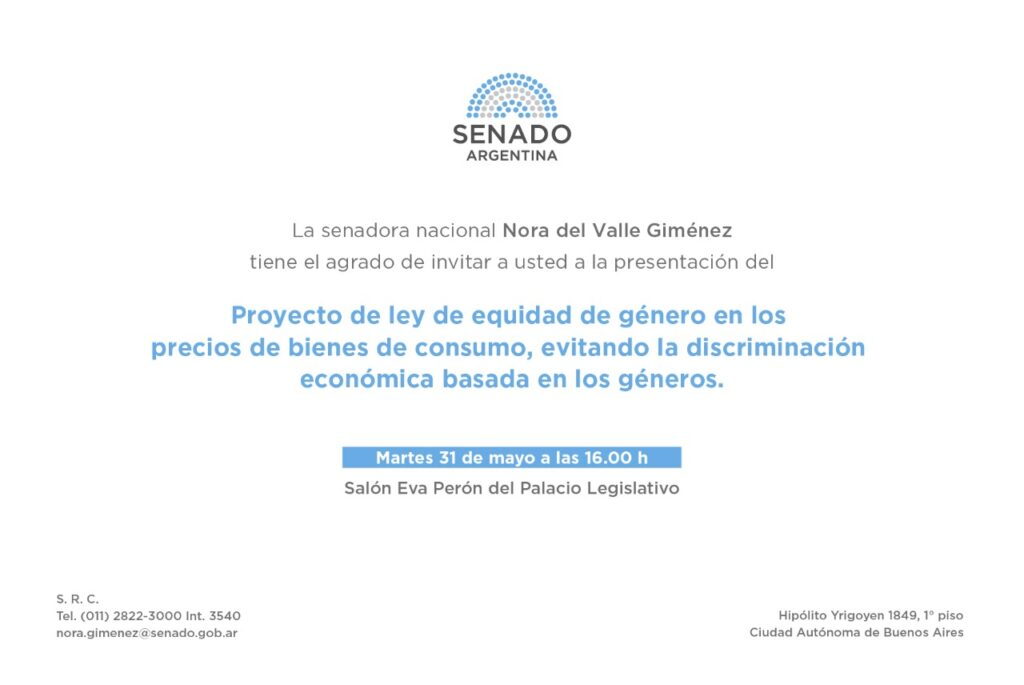 Buenos Aires, Argentina – La iniciativa de la senadora Nora Giménez será acompañada, en el Salón Eva Perón, por un panel de especialistas en el tema. En el Senado de la Nación, hoy a las 16 horas, se realizará la presentación de un proyecto de Ley de Equidad de Género en los precios de […]