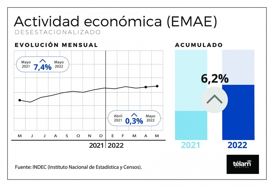 Argentina – El Estimador Mensual de la Actividad Económica acumuló en los primeros cinco meses un incremento del 6,2% en relación a igual lapso de 2021, según el informe del Instituto Nacional de Estadística y Censos. La actividad económica creció en mayo 7,4% en relación a igual mes del año pasado y 0,3% con […]