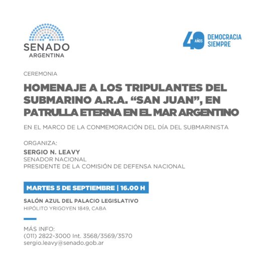 Buenos Aires / Argentina – En el marco del homenaje Por el Día del Submarinista, el senador nacional Sergio Leavy, impulsa una ceremonia de homenaje a los tripulantes que perecieron en el submarino ARA San Juan en el año 2017. “Recordaremos la valentía de los 44 tripulantes del ARA San Juan”, destacó el […]