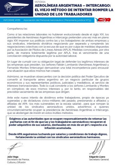 Buenos Aires / Argentina- La Asociación del Personal Aeronáutico (APA) emitió un comunicado en el que acusa a las directivas de Aerolíneas Argentinas e Intercargo de intentar dividir a los trabajadores y romper la unidad de los sindicatos aeronáuticos. En el informe #139, APA denuncia que las empresas han decidido negociar por separado, debilitando […]
