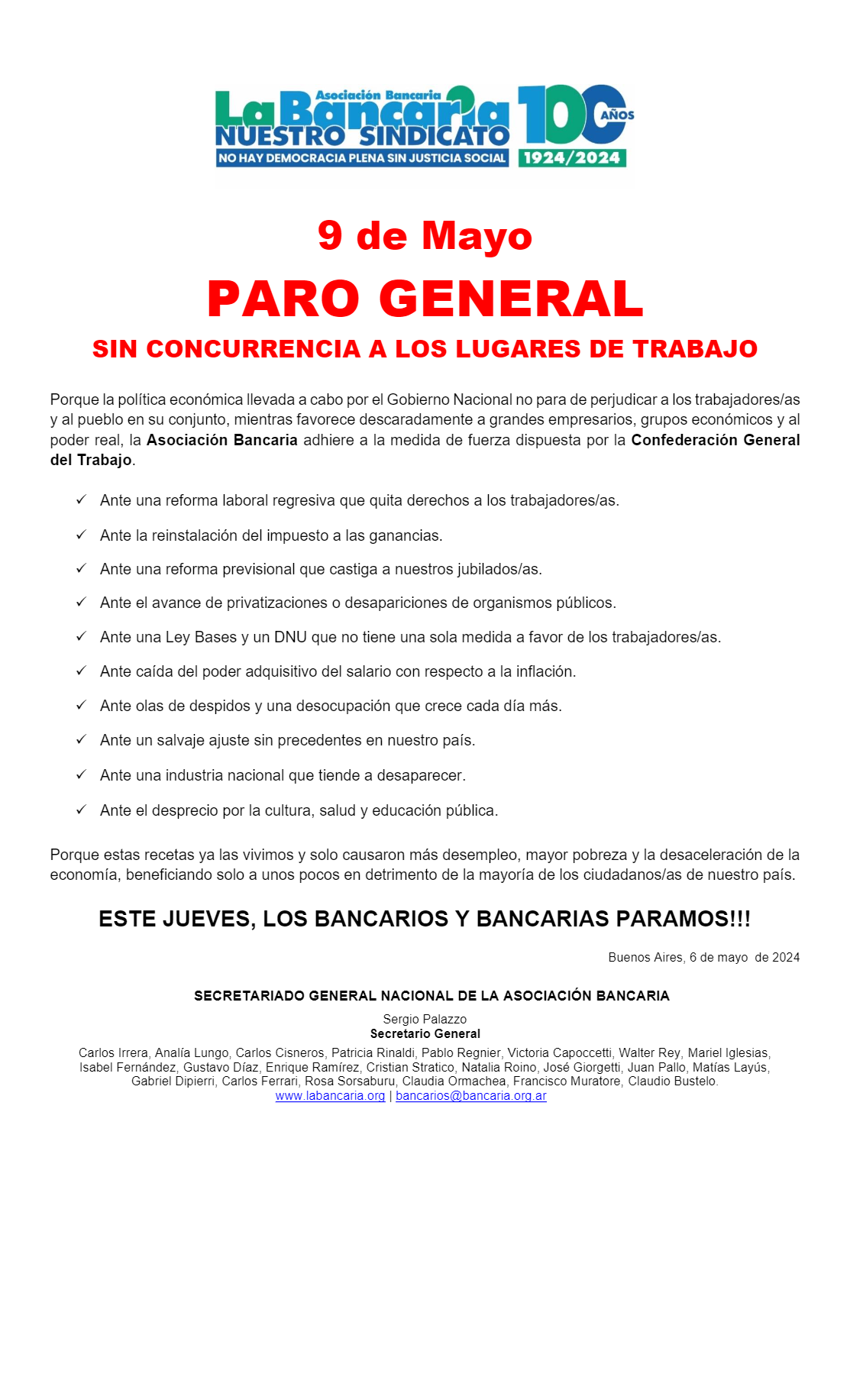 El Secretariado General Nacional de la Asociación Bancaria expresó que estas políticas económicas, ya vividas en el pasado, solo han generado más desempleo, mayor pobreza y la desaceleración de la economía, beneficiando únicamente a unos pocos en detrimento de la mayoría de los ciudadanos/as del país.