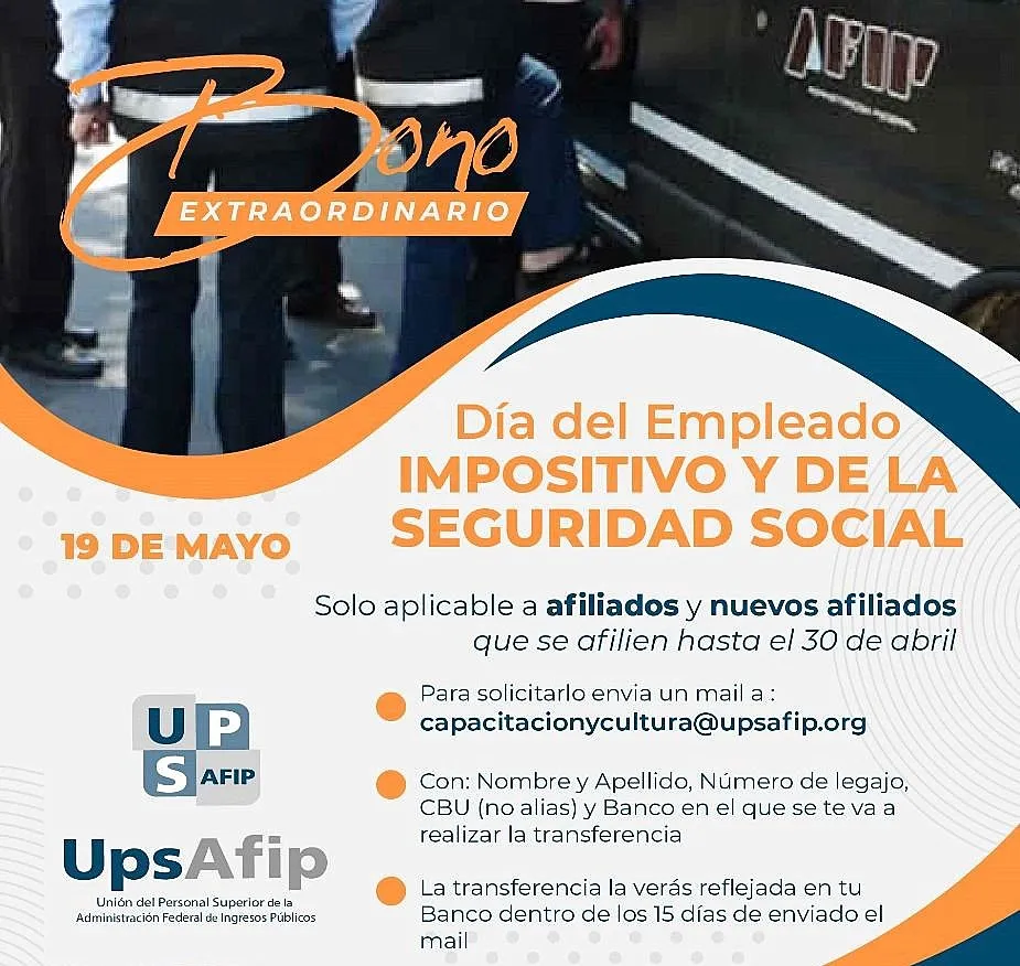 Salta / Argentina – En honor al incansable trabajo de los empleados impositivos y de la seguridad social, la Unión del Personal Superior de la AFIP, anunció el pago del Super Bono de $50.000 a sus afiliados y nuevos afiliados que se unan al gremio hasta el 30 de abril.