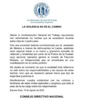 “Desde la Confederación General del Trabajo repudiamos con vehemencia los hechos que se sucedieron durante estos días en nuestro país”, afirmó la CGT en un comunicado difundido anoche.