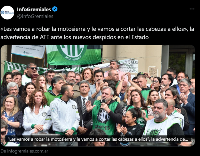 El secretario general de ATE, Rodolfo Aguiar, lanzó una dura advertencia en medio de la creciente tensión: “Les vamos a robar la motosierra y le vamos a cortar las cabezas a ellos”. Sus palabras, que hacen alusión directa al símbolo del ajuste promovido por el actual Gobierno, reflejan la gravedad del conflicto y la disposición del gremio para iniciar medidas de protesta si no se revierten los despidos.