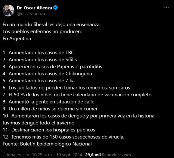 A través de su cuenta de X (exTwitter), Atienza expuso un preocupante informe que abarca desde el aumento de enfermedades infecciosas hasta la falta de acceso a medicamentos por parte de los jubilados.