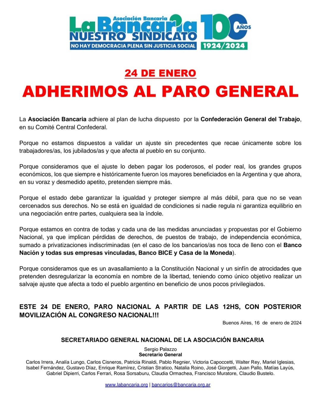 Buenos Aires / Argentina – En un pronunciamiento oficial difundido hoy, La Asociación Bancaria anunció su adhesión al paro nacional convocado por la Confederación General del Trabajo (CGT) para el próximo miércoles 24 de enero. La organización sindical, que representa a los trabajadores bancarios, expresó su rechazo a un ajuste que consideran injusto y que, según ellos, perjudica exclusivamente a los trabajadores, jubilados y al conjunto de la sociedad.