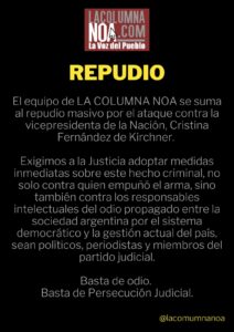 El equipo de LA COLUMNA NOA se suma al repudio masivo por el ataque contra la vicepresidenta de la Nación, Cristina Fernández de Kirchner.