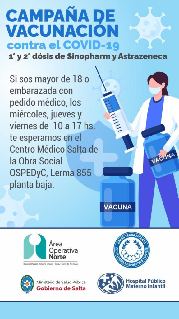 Salta/Argentina.- Eduardo Lazarte, secretario general de UTEDYC Salta y la comisión directiva firmaron convenio con el Hospital Materno Infantil de la Provincia de Salta para la apertura de un Centro Vacunatorio en la sede de la entidad gremial, Lerma 855 para la inoculación de la segunda dosis de Astrazeneca y Sinopharm. Los profesionales médicos recuerdan […]