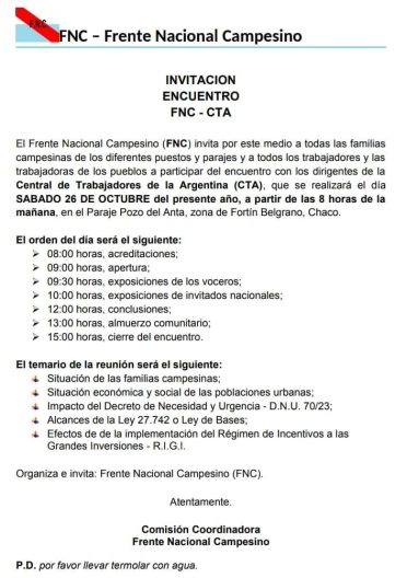 Chaco / Argentina. – El Frente Nacional Campesino (FNC) convocó a todas las familias campesinas y trabajadores rurales a reunión con dirigentes de la Central de Trabajadores de la Argentina (CTA) que se llevará a cabo el sábado 26 de octubre en el Paraje Pozo del Anta, en la zona de Fortín Belgrano, Chaco. El […]