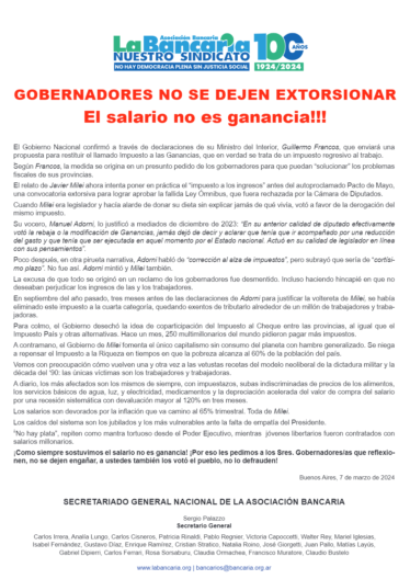 Buenos Aires / Argentina- La propuesta de restituir el Impuesto a las Ganancias es vista como una medida regresiva al trabajo por parte del Gobierno Nacional, mientras se desatienden alternativas más equitativas. La Asociación Bancaria insta a los gobernadores a no dejarse engañar y a considerar el impacto en los trabajadores. El Gobierno Nacional, a […]