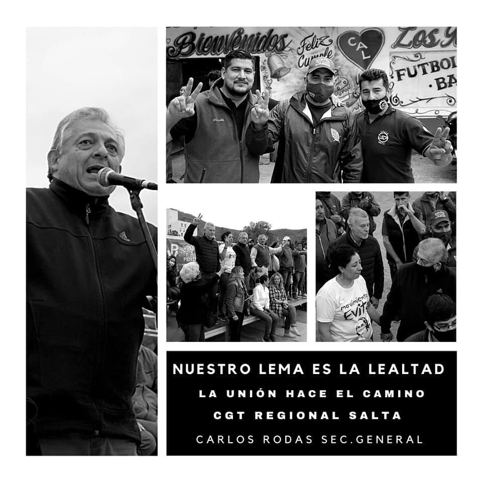 Salta/Argentina.- El lunes 18-10-21 en el acto que organizó la CGT con el concurso del Movimiento Evita y Organizaciones Sociales en el Club Libertad, la central obrera con la firma de su titular y dirigente bancario, Carlos Rodas, dio a conocer el siguiente documento: ” La lealtad a Perón y a su doctrina es siempre con los trabajadores y las trabajadoras en defensa de los derechos y conquistas laborales. Levantando las banderas del desarrollo, la producción y el trabajo. Rechazando cualquier intento de flexibilización y destrucción del empleo. Defendemos el aparato productivo nacional, la demanda de políticas que promueven la generación de empleo genuino y la reconstrucción de un Estado presente, regulador de la economía y promotor del desarrollo económico y social. Unidad de las y los trabajadores, como símbolo de unidad del Movimiento Obrero organizado y con vocación de sostener la unidad del peronismo. Lealtad a un modelo de país bajo la doctrina de la Justicia Social, la Independencia Económica y la Soberanía Política. Hoy más que nunca, en hermandad el movimiento obrero organizado junto a los movimientos sociales, han demostrado en nuestra tierra que el anhelo de la materialización de los principios de nuestra doctrina están más vigentes que nunca. Es con las y los trabajadores, es con la reconversión de planes a trabajo registrado, es con el pueblo!”.