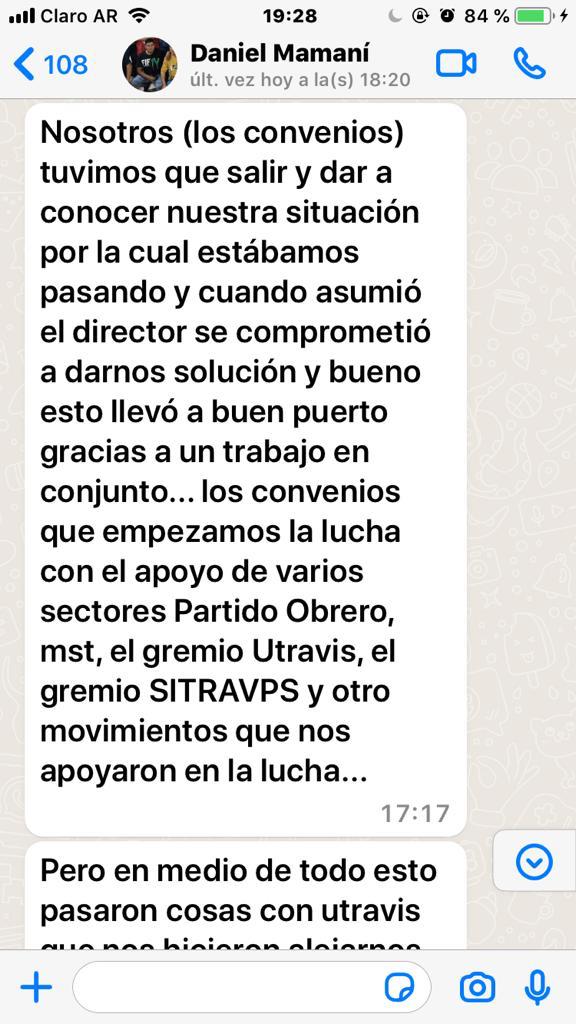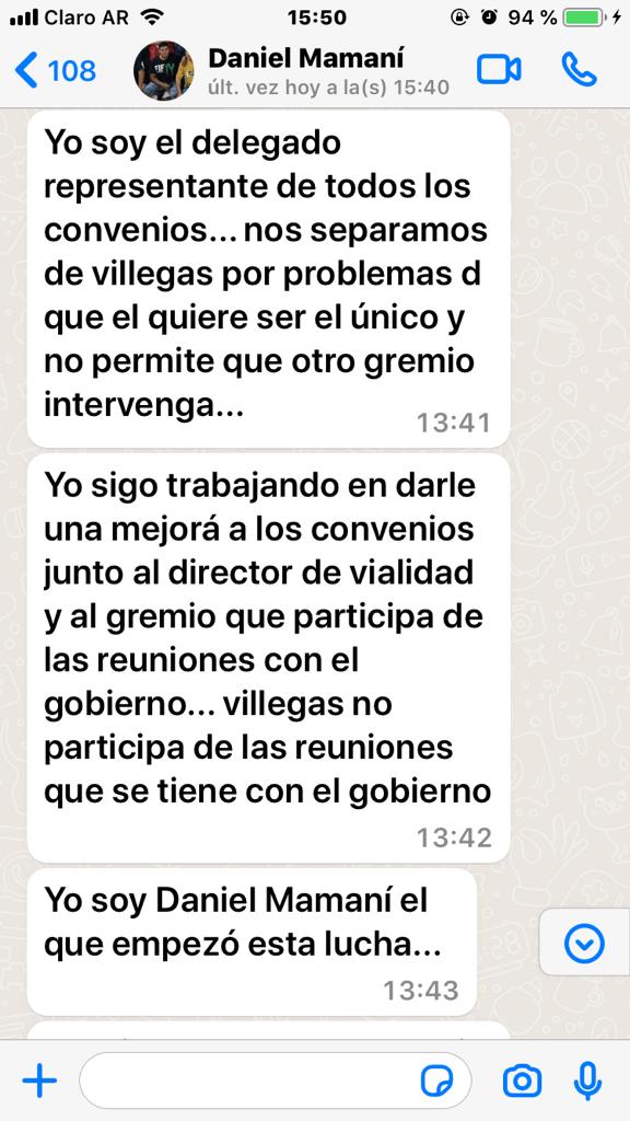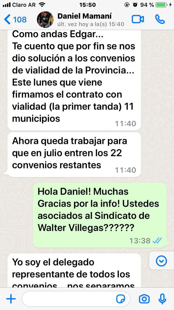 Salta/Argentina.- Daniel Mamani, delegado sin organización sindical de los trabajadores precarizados de Vialidad de Salta, firmará el lunes 4 de abril, los convenios con Jorge Gonzalo Macedo, director de Vialidad de la Provincia mediante los cuales el personal regulariza su situación legal con la suscripción de contratos temporarios de 1 año de duración- trámite previo a planta permanente- de obreros de 33 municipios. En los mensajes de whatsapp que envio a la redacción de LaColumnaNOA, desmintió su vinculación con la Unión de Trabajadores Viales que preside Walter Villegas: “Nos separamos de Villegas por problemas de que él quiere ser el único y no permite que otro gremio intervenga”, manifestó. Un dato no menor, es la primera vez que una repartición estatal, firmará un convenio con un delegado que proviene de El Bordo (Gral. Güemes) y que no pertenece a ninguna de las dos entidades sindicales: Unión de Trabajadores Viales (Walter Villegas) y Sindicato de Trabajadores de Vialidad de Salta (Rolando Ovejero). Acá, nos debemos plantear la siguiente pregunta: ¿Cuál es rol de las organizaciones sindicales en la defensa de la clase trabajadora? A continuación la conversación por Wpp: