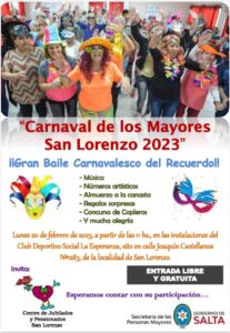 El denominado “Carnaval de los Mayores San Lorenzo 2023” se desarrollará el próximo lunes 20 de febrero, desde las 11 horas, en el Club Deportivo Social La Esperanza, ubicado en la calle Joaquín Castellanos N°1283, en la localidad de San Lorenzo. La entrada es libre y gratuita