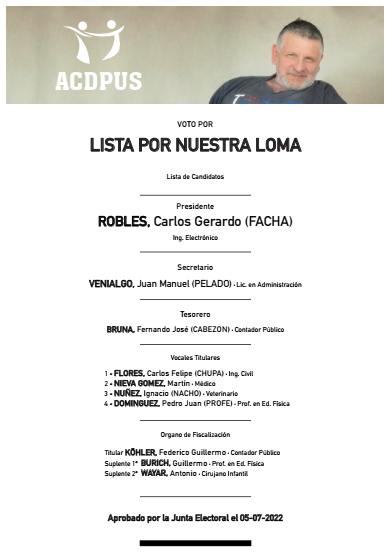 Salta/Argentina.- Carlos “Facha” Robles, ingeniero electrónico, candidato a presidente por la Lista Por Nuestra Loma, se impuso en forma categórica y contundente a la Lista Oficial Unidad del abogado Rodrigo “Pichón” Martínez Urquiza en las elecciones de comisión directiva de la Asociación de Profesionales Universitarios de Salta – ACDPUS- más conocido como Club La Loma- que se realizaron ayer sábado en coincidencia con la conmemoración del 9 de Julio de 1816, la Declaración de la Independencia de Argentina del yugo español. En términos futbolísticos, podríamos decir, que ganó por goleada en el tiempo reglamentario. El escrutinio final arrojó el siguiente resultado: Lista Por Nuestra Loma 601 votos; Lista Unidad 246 votos. La gestión anterior de Robles, que marcó un récord de obras realizadas, es el mejor respaldo que ilusiona a los socios en esta segunda presidencia.