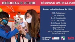 Salta / Argentina – La actividad se efectúa en el marco del Día Mundial de Lucha contra la Rabia.  Se trabajará en los CICs de Solidaridad, Limache, Constitución, Santa Cecilia, Asunción y en la plaza del Deporte, en Tres Cerritos. También habrá un puesto en villa Luján.
