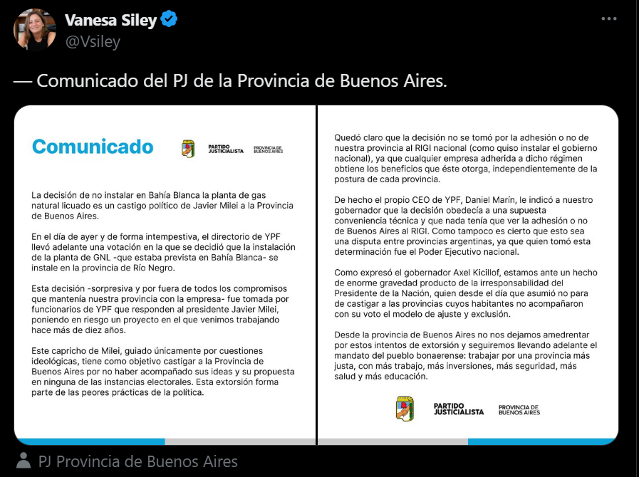 La decisión de no instalar en Bahía Blanca la planta de Gas Natural Licuado (GNL) es un castigo político de Javier Milei a la Provincia de Buenos Aires. Esta decisión -sorpresiva y por fuera de todos los compromisos que mantenía nuestra provincia con YPF- fue tomada por funcionarios de la empresa que responden al presidente Javier Milei, poniendo en riesgo un proyecto en el que venimos trabajando hace más de diez años”, manifestó la fuerza bonaerense, al tiempo que calificó como “intempestiva” la definición que priorizó a Río Negro.