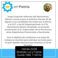 Con el objetivo de salgen.it delinear una mesa de trabajo se reunirán para delinear acciones para el gran desafío electoral del próximo 22 de octubre, el encuentro está previsto para este viernes 25 de Agosto en el Sindicato Luz y Fuerza, Zuviria 1085, a las 11:00 horas. La invitación es extendida a candidatos de Unión por la Patria, La CGT Salta, Las 62 Organizaciones peronistas, la CTA, y el Movimiento Obrero Ampliado.