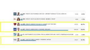 Con la totalidad de las mesas escrutadas (1239), el senador provincial Emiliano Durand, obtuvo el 37.47 % de los votos, en tanto que Bettina Romero logró el segundo lugar, con el 20,37 %. Sorprendió además, el tercer puesto alcanzado por el ex radical y ex Urtubey, Matías Posadas, de Juntos por el cambio, con un 12,19% y en cuarto puesto se ubicó el ingeniero Felipe Biella, de Salta Independiente que integró la alianza Avancemos con Emiliano Estrada (actual diputado nacional del Frente de Todos) y Carlos Zapata (tambièn diputado nacional del amarillo Alfredo Olmedo), con un 10,91 %.