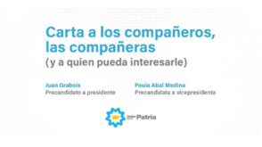 “Empieza un partido con la cancha inclinada. Nuestro rival tiene recursos y medios infinitamente superiores. Nosotros no gozamos de la simpatía de círculos rojos ni poderes externos. Fácil no va a ser. Pero quién dice… no siempre gana Goliat ¿Se acuerdan de esa historia? Con una gomera como la que usan los pibes para jugar, el joven campesino y poeta le ganó al gigante. ¿Cuál es la honda, la gomera nuestra? La coherencia, las convicciones, el coraje, la creatividad, los valores éticos y la fuerza de la militancia”, dice el texto. En un fragmento, el dirigente también, dedica unas palabras en relación a la vicepresidenta Cristina Fernández. El comunicado que fue difundido a través de las redes sociales, lleva la firma de Juan Grabois y de Paula Abal Medina, pre candidata a vice presidencia.