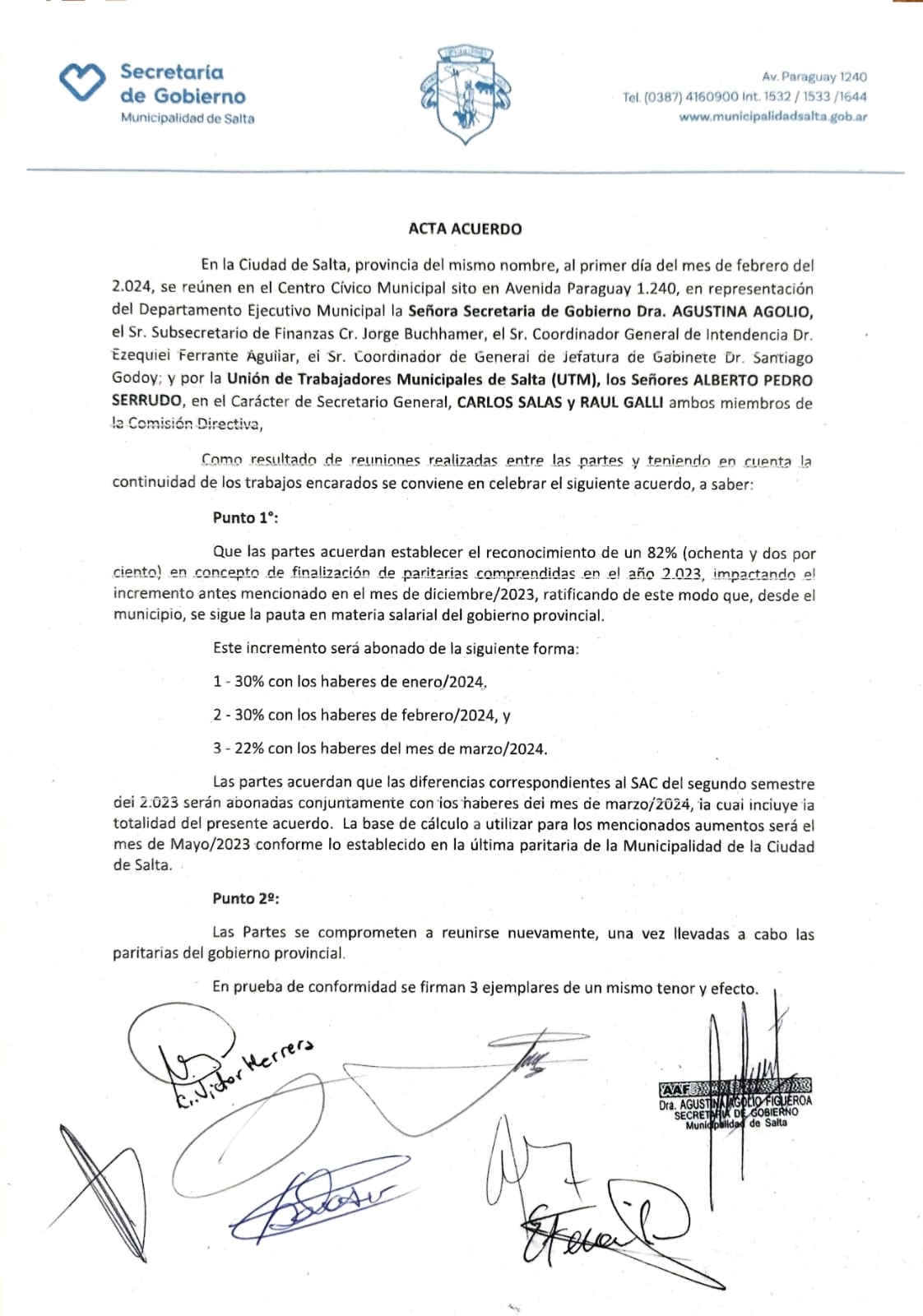 En un esfuerzo conjunto entre el Municipio y la Unión de Trabajadores Municipales (UTM), se ha cerrado con éxito la negociación de las Paritarias Salariales 2023 en la ciudad de Salta. Tras prolongadas discusiones y un acercamiento progresivo de posiciones, este mediodía se firmó un Acta Acuerdo entre la Unión de Trabajadores Municipales y el Ejecutivo Municipal de Salta.