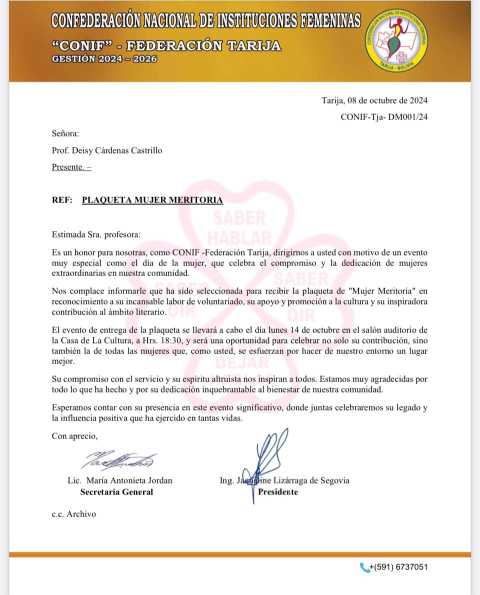 Tarija / Bolivia.- La CONIF-Federación Tarija realizará un acto especial este lunes 14 de octubre para reconocer a mujeres destacadas y dar posesión a nuevas instituciones en un evento en la Casa de la Cultura. En esta ocasión, y en el marco de la Día de la Mujer Boliviana, Daisy Cárdenas Castrillo, abogada, profesora y escritora, recibirá el premio La Mujer Meritoria.