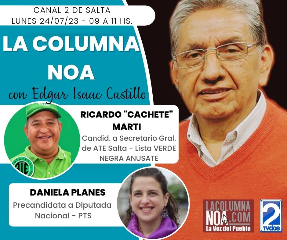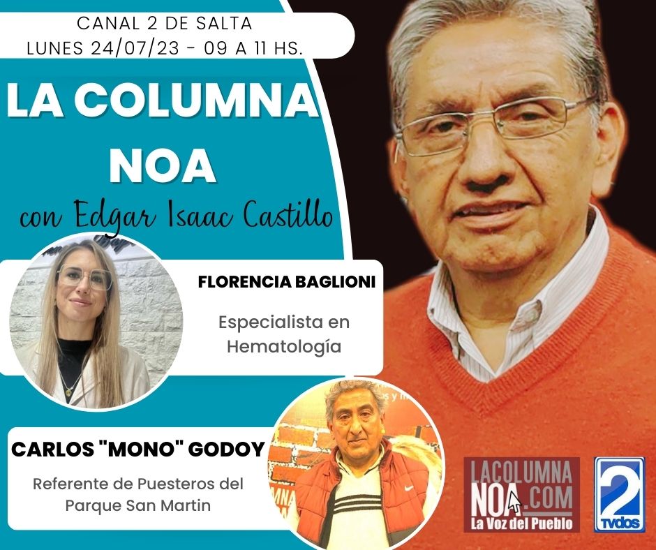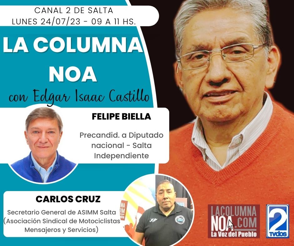Salta / Argentina.- Hoy 24 de julio, Ingeniero Felipe Biella, candidato a diputado nacional expondrá su propuesa en LaColumnaNOA que trasmitirá desde Canal 2 de Salta y en dúplex por Radio FM 104.9 “La Radio del Guille”. En VIVO por Facebook en TV Canal 2 Salta. El menú de invitados es el siguiente: Presidente de la Feria San Martín, Carlos “Mono” Godoy; Los dirigentes de los sindicatos de mensajeros y cadetes, Carlos Cruz, sec.gral de Asociación Sindical de Motociclistas, Mensajeros y Servicios -ASIMMS- , y Marcelo Nina, sec. gral. ASUMRA,, explicarán, las razones del archivo del proyecto de ley que regula la actividad de los mensajeros, cadetes y delivery en Salta; Daniela Planes, precandidata a diputada nacional por el Frente de Izquierda, se referirá a la tasa de femicidios en Salta y denunciará la intención del gobierno de suspender Educación Sexual Integral de las escuelas; La Dra Florencia Baglioni, especialista en Hematología y Hemoterapia, de Buenos Aires, explicará que es la Leucemia, cómo se diagnostica y su tratamiento. En el segmento musical, se presentará el guitarrista Jorge Pampero, quien también es secretario general del Sindicato de Vendedores Ambulantes de Salta.