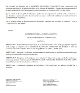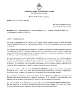 Argentina – El mandatario argentino decretó feriado nacional para este martes por los festejos y el acompañamiento de la población a los jugadores de la Selección tras consagrarse ayer campeón del mundo en Qatar.