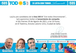 Salta/Argentina.- El secretario general del Sindicato de Camioneros y ex titular de la CGT Salta, Jorge Guaymás, lanzará mañana su candidatura a diputado nacional por el Frente de Todos Sinceramente. El acto, se realizará, a partir de las 10, en el Teatrino, Aniceto Latorre 1211 y contará con la presencia de los compañeros de su lista: “Kitty” Blanco, Jorge Villazón, Claudia Gutiérrez, Augusto Palma e Irma Torres. Acompañarán a Guaymás, quien lidera la Lista 505 B, dirigentes y delegados de la CGT, 62 Organizaciones y CTA, quienes con su presencia, manifestarán su apoyo a esta candidatura, porque consideran que es el único representante del Movimiento Obrero que les garantizará el cumplimiento de la justicia social, independencia económica y soberanía popular, banderas irrenunciables del peronismo desde en 1945 con la aparición de su fundador, General Juan Domingo Perón, quien además recalcó, en todos sus discursos, que el movimiento obrero es la columna vertebral del Movimiento Nacional Justicialista.