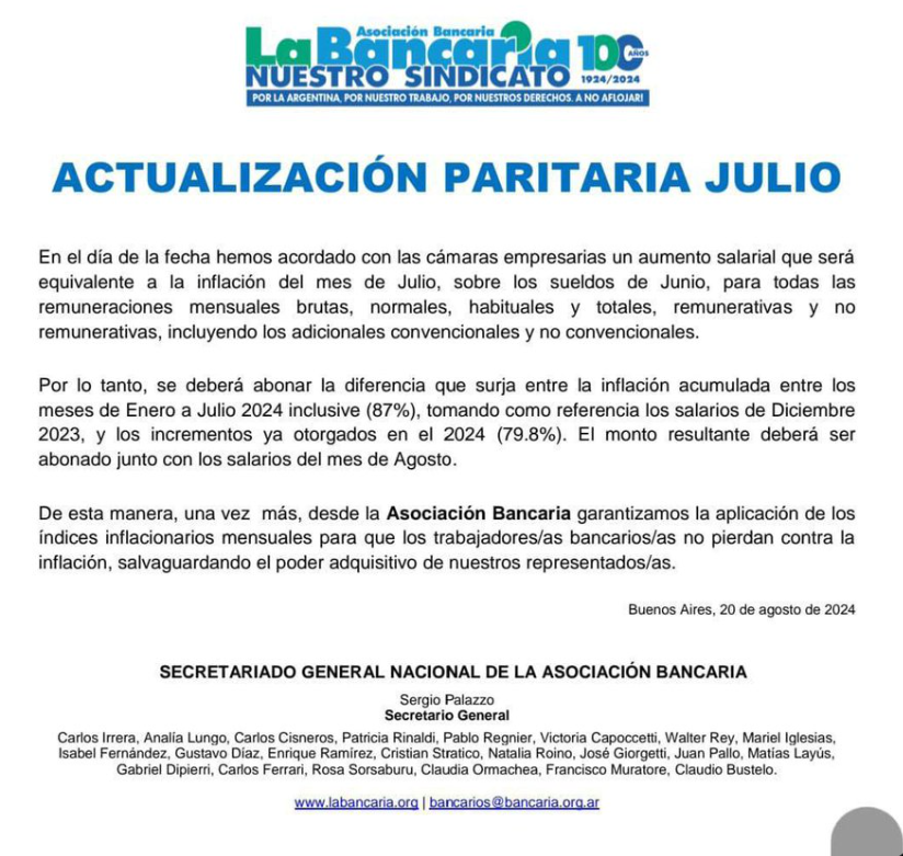 Con este nuevo acuerdo, la Asociación Bancaria reafirma su compromiso de proteger el poder adquisitivo de los trabajadores y trabajadoras del sector. “Una vez más, garantizamos la aplicación de los índices inflacionarios mensuales para que nuestros representados/as no pierdan frente a la inflación”, señalaron desde el Secretariado General Nacional de la organización sindical.