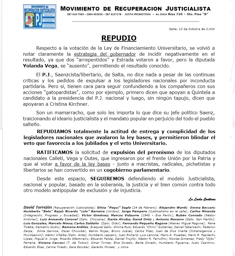 El Movimiento de Recuperación Justicialista, encabezado por David Torrejón y Silvia “Pequi” Sagle, emitió un comunicado en repudio a la reciente votación de la Ley de Financiamiento Universitario. Según el documento, la estrategia del gobernador de Salta habría influido negativamente en el resultado, logrando que algunos legisladores votaran a favor de la ley, mientras que la diputada Yolanda Vega se ausentó, lo que facilitó su aprobación.