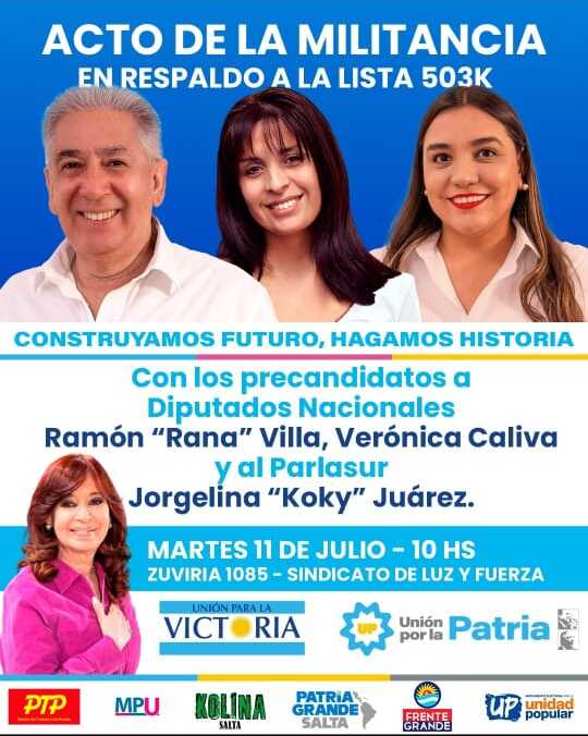 El martes 11 de julio de 2023, se realizó el acto de presentación de los precandidatos a diputados nacionales y diputada al ParlaSur, Jesús Ramón “Rana” Villa,Verónica Caliva y Jorgelina “Koky” Juárez, respectivamente en el local del Sindicato de Luz y Fuerza, Zuviría 1085. También participaron Daniel Escotorín (Unidad Popular), Pedro Yiyo Guzmán (CTEP) y Maira López (Nuevo Encuentro). La nota de color, la dio la presencia de la mascota de “Rana” Villa, que provocó que grandes y chicos, se acercarán para tomarse una selfie.