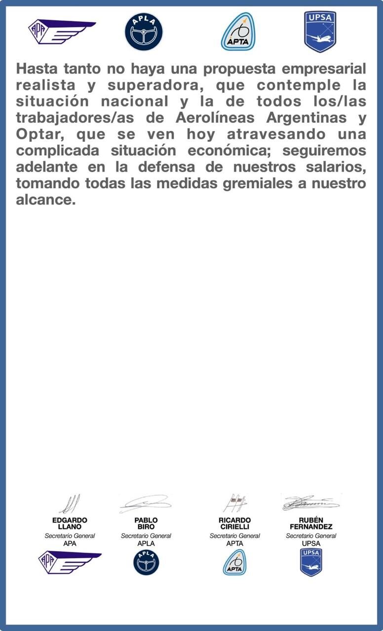 Los cuatro gremios, finalizan el comunicado, expresando que hasta tanto no haya una propuesta empresarial realista y superadora, que contemple la situación nacional y de los trabajadores, que atraviesan una complicada situación económica; seguiremos adelante en la defensa de nuestros salarios, tomando todas las medidas gremiales a nuestro alcance.
