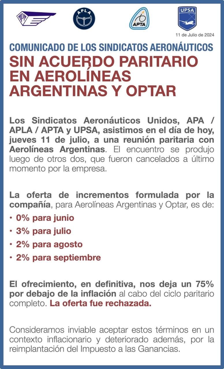 Dicho encuentro se realizó luego de que otras dos reuniones fueran canceladas a último momento por la compañía. La oferta realizada por la empresa fue rechazada categóricamente por el frente gremial dado que computando el ciclo paritario completo los salarios de los aeronáuticos quedan un 75% debajo de la inflación acumulada a lo que se le suma la reimplantación del impuesto a las ganancias.