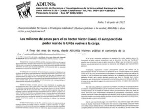 Salta / Argentina – El gremio de docentes ADIUNSa de la Universidad Nacional de Salta denunció una polémica resolución del Consejo Superior Universitario, mediante la cual se habilita al ex rector el acumulado de 286 días correspondientes a vacaciones no tomadas por Claros, durante los últimos años en que estuvo en la función pública. Anticiparon una avalancha de demandas ante los juzgados de trabajo en caso que se autorice este ardid legal.