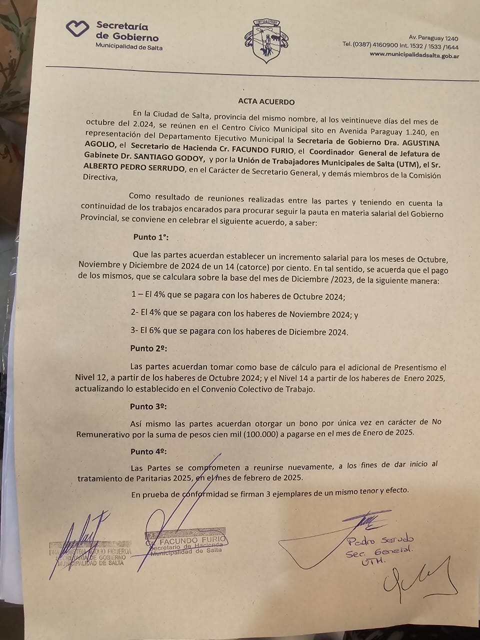 Salta, Argentina- La Unión de Trabajadores Municipales (UTM), signataria del Convenio Colectivo de Trabajo (CCT) para los empleados municipales de la Ciudad de Salta, alcanzó un significativo acuerdo en las recientes paritarias.