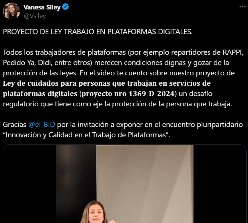Buenos Aires, Argentina- La Diputada Nacional y Secretaria General de la Federación de Sindicatos de Trabajadores Judiciales, Vanesa Siley, impulsó una iniciativa legislativa que busca garantizar condiciones laborales dignas para trabajadores de aplicaciones como Rappi, Pedido Ya y Didi. En un video publicado en su cuenta de Twitter, Siley destacó la importancia de esta regulación para proteger a quienes desempeñan labores en servicios de plataformas digitales.
