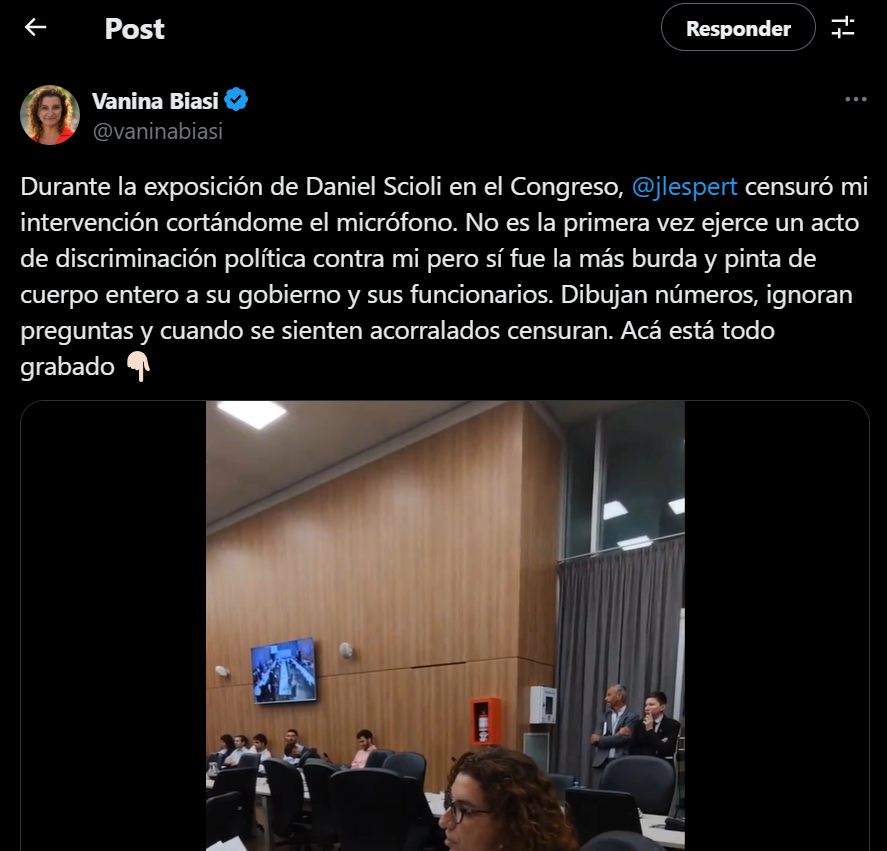 Buenos Aires, Argentina- En un tenso episodio en el Congreso, Vanina Biasi, Diputada Nacional, denunció públicamente haber sido censurada durante la intervención de Daniel Scioli, quien se encontraba presentando informes sobre la gestión del gobierno. Según la denunciante, José Luis Espert, diputado del Congreso Nacional, fue quien cortó su micrófono en medio de su intervención, en lo que calificó como un acto de “discriminación política”.