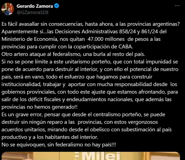 “Si no se pone límite a este unitarismo porteño, que con total impunidad se pone de acuerdo para destruir al interior y con ello el potencial de nuestro país, será en vano todo el esfuerzo que hacemos desde los gobiernos provinciales”, advirtió Zamora en su publicación.